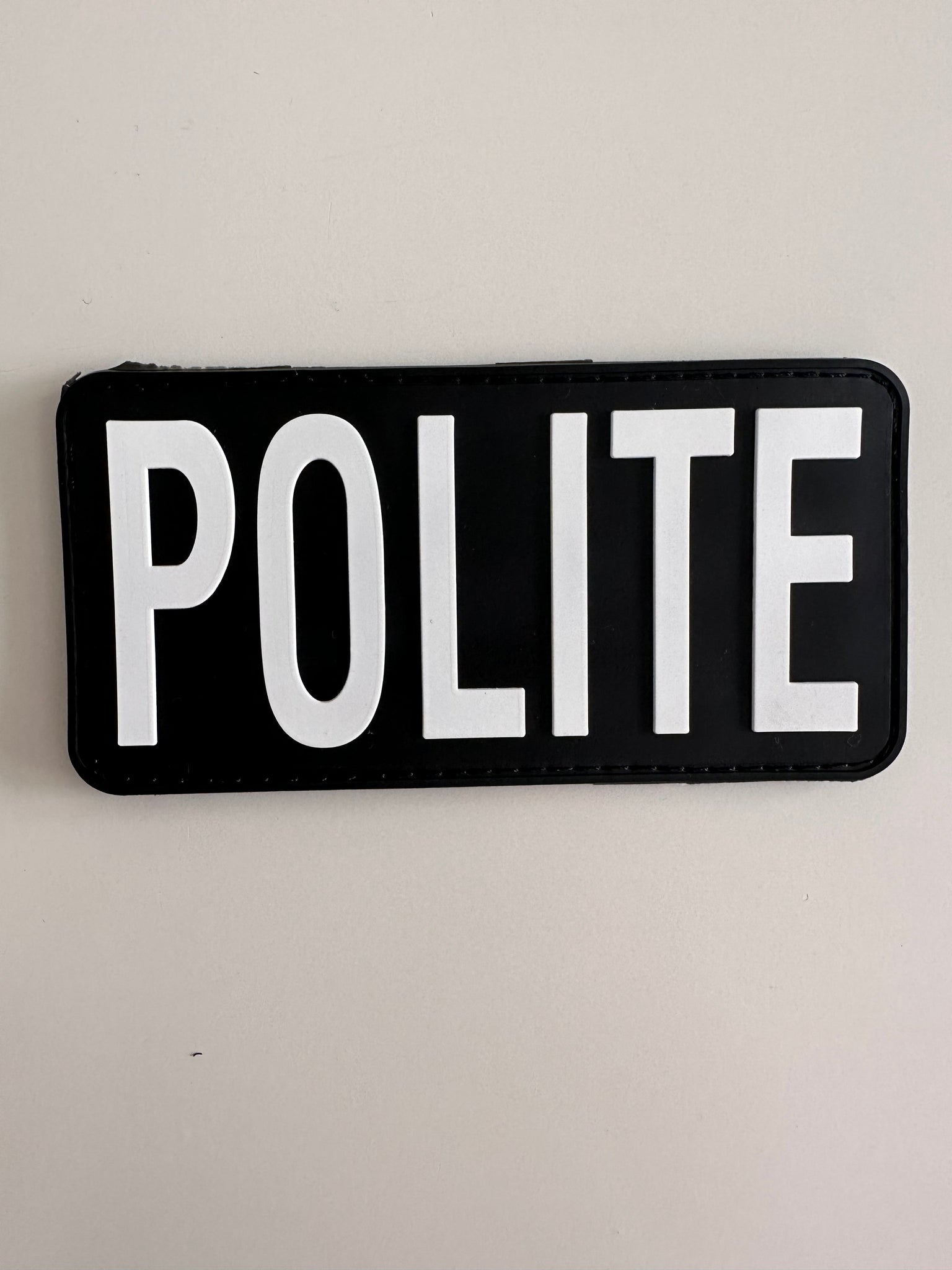 The pvc POLITE patch is 6”L x 3”W with hook on the reverse.